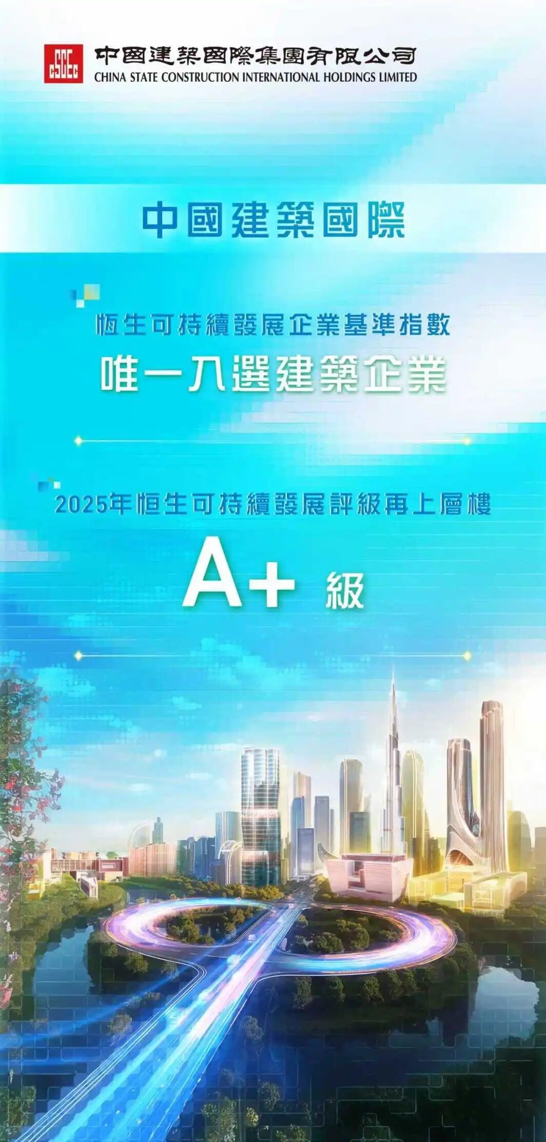近日,恒生指数公司发布2025年上市公司可持续发展评级结果。中海集团旗下中国建筑国际集团有限公司凭借ESG(环境、社会及治理)方面的良好表现,评级由A上调至A+,再度入选恒生可持续发展企业基准指数(简称HSSUSB)——再度成为唯一入选的建筑企业。